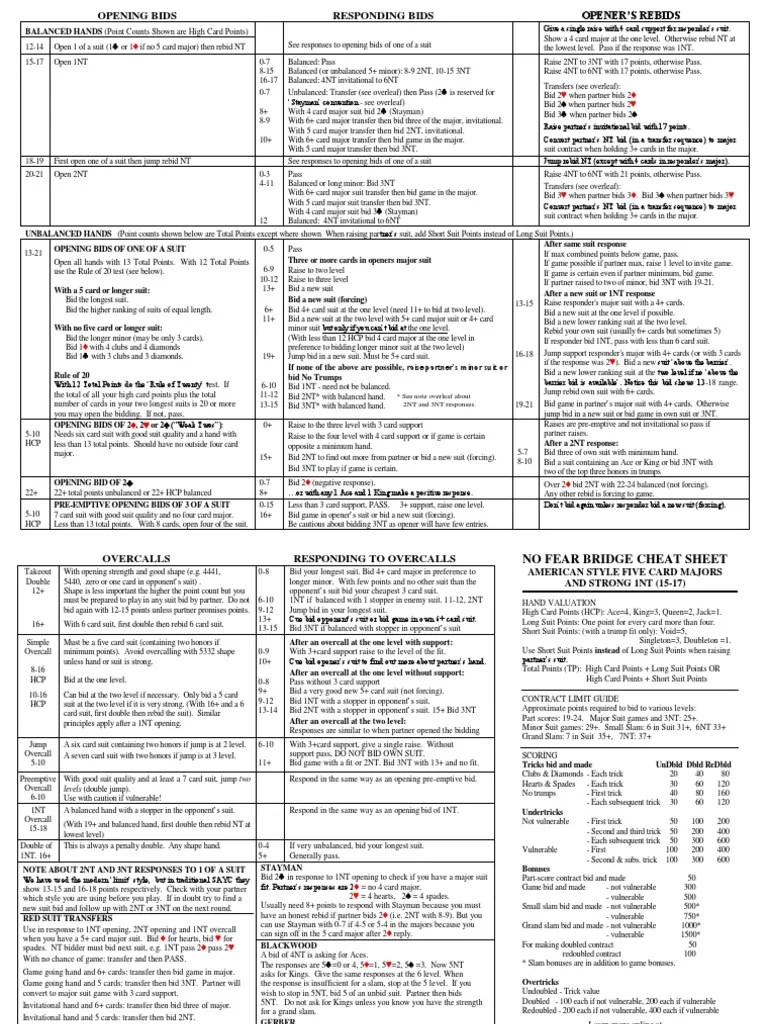 Ron klinger bridge article 'get your 10 free bridge cheat sheets' as well as thousands of other articles on bridge! In bridge, to make game, you need to score 100 points. Practice playing under normal club conditions, like playing to time and . Useful for those just out of classes. Beginning bridge bidding cheat sheet opening bids: Opening:with a typical unbalanced hand: < 13 points, 6 clubs. Use a 'cheat sheet' if you want and ask the supervisor for advice when you need it. It is a strong club. Excellent quick reference for new players to have at the table. You can have them at the table with you for a while, as a prompt. A handy reference for newer players. Precision club is a bidding system in the game of contract bridge.